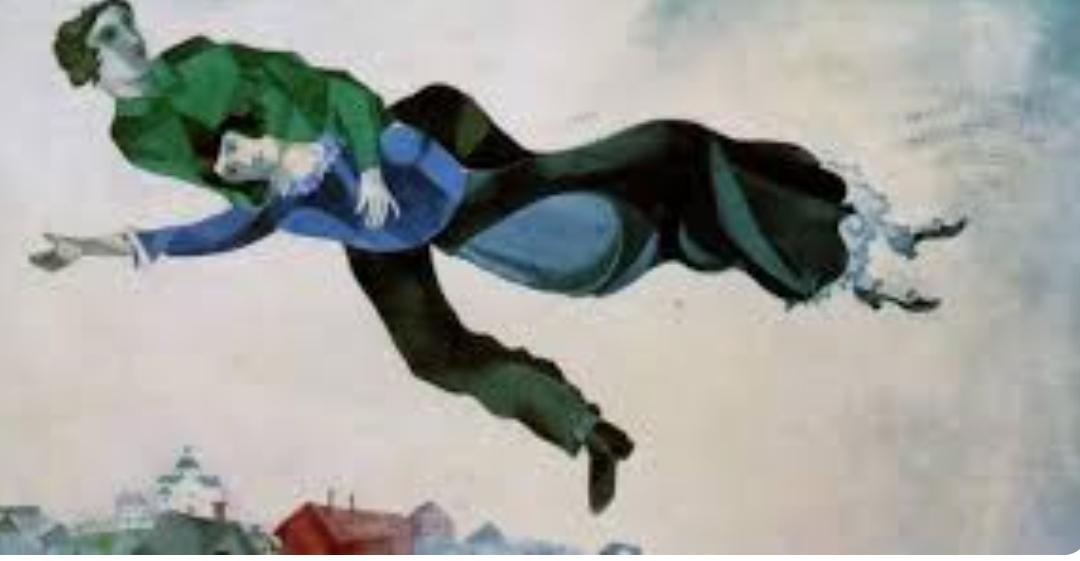 3. Доберіть до ілюстрації єврейського художника Марка Шагала "Над містом" відповідну цитату за повістю Шолом-Алейхема "Пісня над піснями" (Частина друга, 6). Що значить для Шимека цей образ?