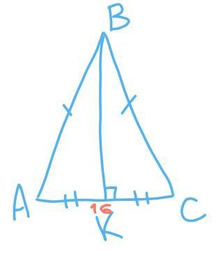 По правилу: в равнобедренном треугольнике высота, проведённая к основанию, является биссектрисой и медианой. Нам интересно то, что высота является медианой. Медиана — отрезок в треугольнике, соединяющий вершину треугольника с серединой стороны, противоположной этой вершине. То есть, если BK — это медиана, то
