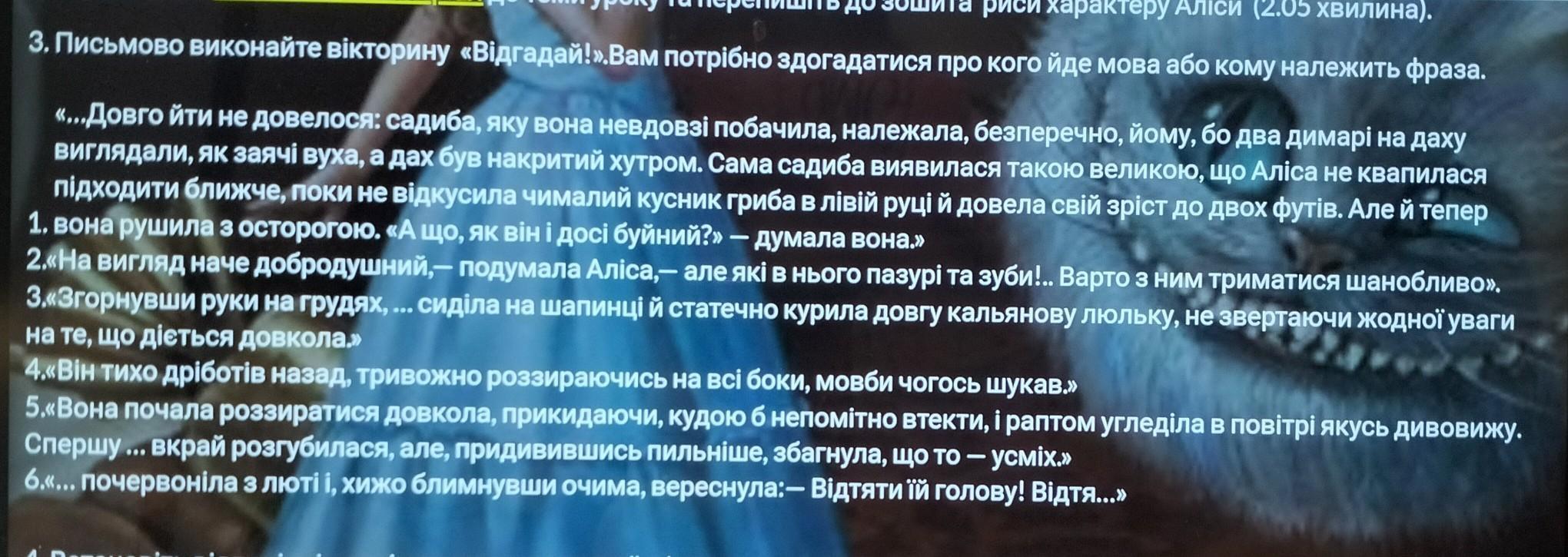 3. Письмово виконайте вікторину «Відгадай!».Вам потрібно здогадатися про кого йде мова або кому належить фраза. «...Довго йти не довелося: садиба, яку вона невдовзі побачила, належала, безперечно, йому, бо два димарі на даху виглядали, як заячі вуха, а дах був накритий хутром. Сама садиба виявилася такою великою, що Аліса не квапилася підходити ближче, поки не відкусила чималий кусник гриба в лівій руці й довела свій зріст до двох футів. Але й тепер 1. вона рушила з осторогою. «А що, як він і досі буйний?» — думала вона. 2. На вигляд наче добродушний,— подумала Аліса,— але які в нього пазурі та зуби!.. Варто з ним триматися шанобливо». 3. Згорнувши руки на грудях, ... сиділа на шапинці й статечно курила довгу кальянову люльку, не звертаючи жодної уваги на те, що діється довкола 4. Він тихо дріботiв назад, тривожно роззираючись на всі боки, мовби чогось шукав 5. «Вона почала роззиратися довкола, прикидаючи, кудою б непомітно втекти, і раптом угледіла в повітрі якусь дивовижу. Спершу ... вкрай розгубилася, але, придивившись пильніше, збагнула, що то — о - усміх» 6.".... почервоніла з люті I, хижо блимнувши очима, вереснула: — Відтяти їй голову! Відтя...."