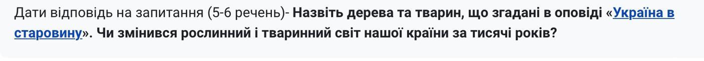 У оповіді «Україна в старовину» згадуються такі дерева, як дуб, ясен, клен, липа, явір, верба та інші. З тварин згадується косуля, кабан, заєць, лисиця та інші. Рослинний і тваринний світ України змінився за тисячі років під впливом природних та антропогенних чинників. Багато видів тварин та рослин зникли або стали на межі вимирання, але також з'явилися нові види. Змінилося також розповсюдження окремих видів, їх життєві умови та звички.