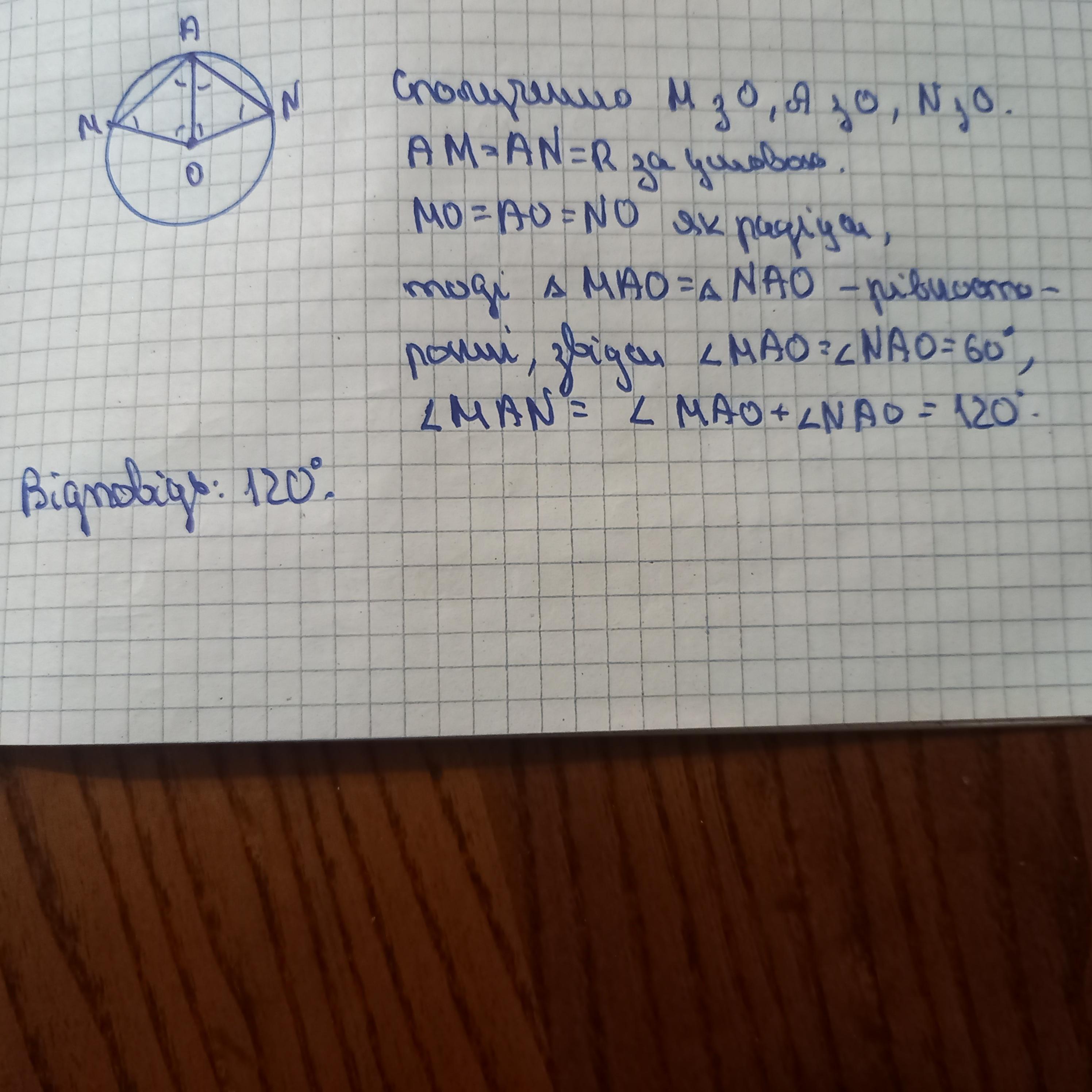 Кожна з хорд АМ і AN кола дорівнює радіусу цього кола. Знайдіть кут MAN