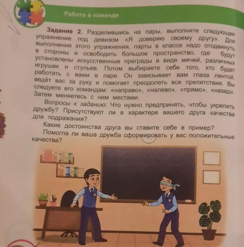 Задание 2. Разделившись на пары, выполните следующее упражнение под девизом «Я доверяю своему другу». Для выполнения этого упражнения, парты в классе надо отодвинуть в стороны и освободить большое пространство, где будут установлены искусственные преграды в виде мячей, различных игрушек и стульев. Потом выбираете себе того, кто будет работать с вами в паре. Он завязывает вам глаза лесно той, ведёт вас за руку и помогает преодолеть все препятствия. Вы следуете его командам: «направо», «налево», «прямо», «назад». Затем меняетесь с ним местами. Вопросы к заданию: Что нужно предпринять, чтобы укрепить дружбу? Присутствуют ли в характере вашего друга качества для подражания? Какие достоинства друга вы ставите себе в пример? Помогла ли ваша дружба сформировать у вас положительные качества?