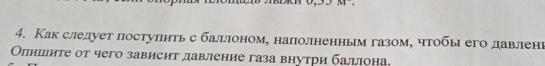 опорная площадь лыжи 0,35 м². 4. Как следует поступить с баллоном, наполненным газом, чтобы его давле Опишите от чего зависит давление газа внутри баллона. Срочноооо помогите пжпж!!!!!!