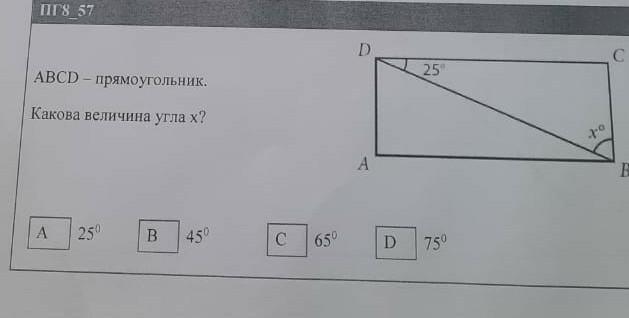 ПГ8 57 ABCD-прямоугольник. Какова величина угла х? A 25⁰ B 45⁰ C 65⁰ D A D 25⁰ 75⁰ to С B