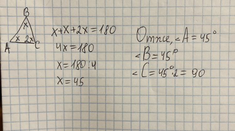 отже, кути трикутника: 45, 45 і 90 градусів.