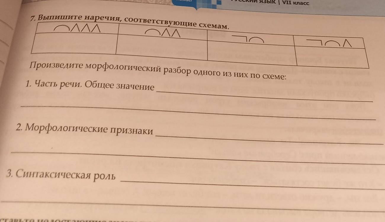 7. Выпишите наречия, соответствующие схемам. м Произведите морфологический разбор одного из них по схеме: 1. Часть речи. Общее значение 2. Морфологические признаки 3. Синтаксическая роль
