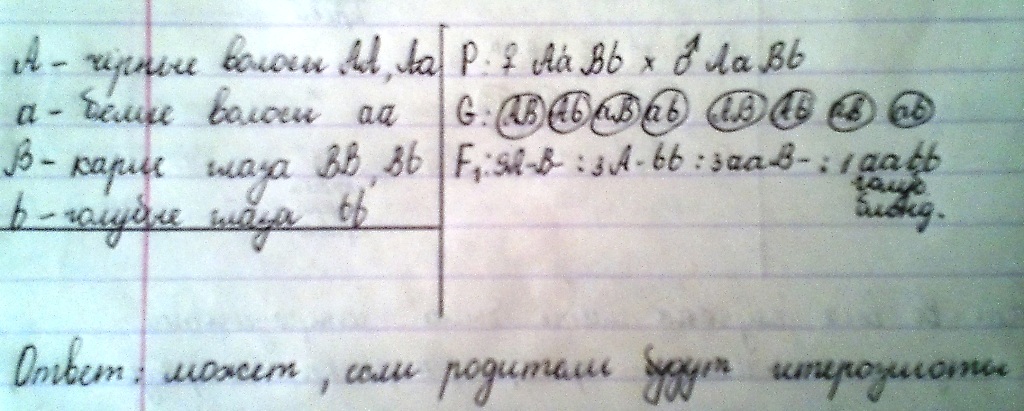 Мужчина с черными волосами и карими глазами вступил в брак с женщиной с черными волосами и карими глазами. Могут ли быть дети с голубоглазыми блондинами? Если известно, что карие глаза и черные волосы доминантный признак.