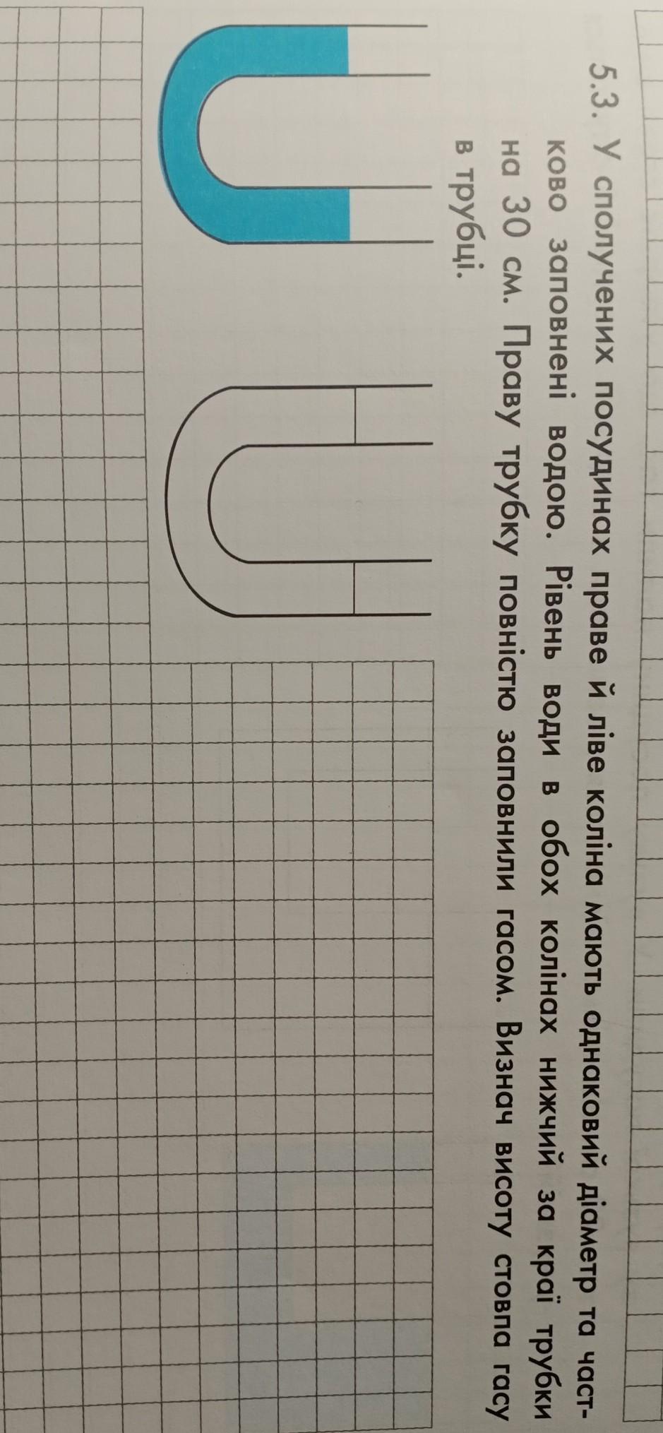5.3. У сполучених посудинах праве й ліве коліна мають однаковий діаметр та част- ково заповнені водою. Рівень води в обох колінах нижчий за краї трубки на 30 см. Праву трубку повністю заповнили гасом. Визнач висоту стовпа гасу в трубці.