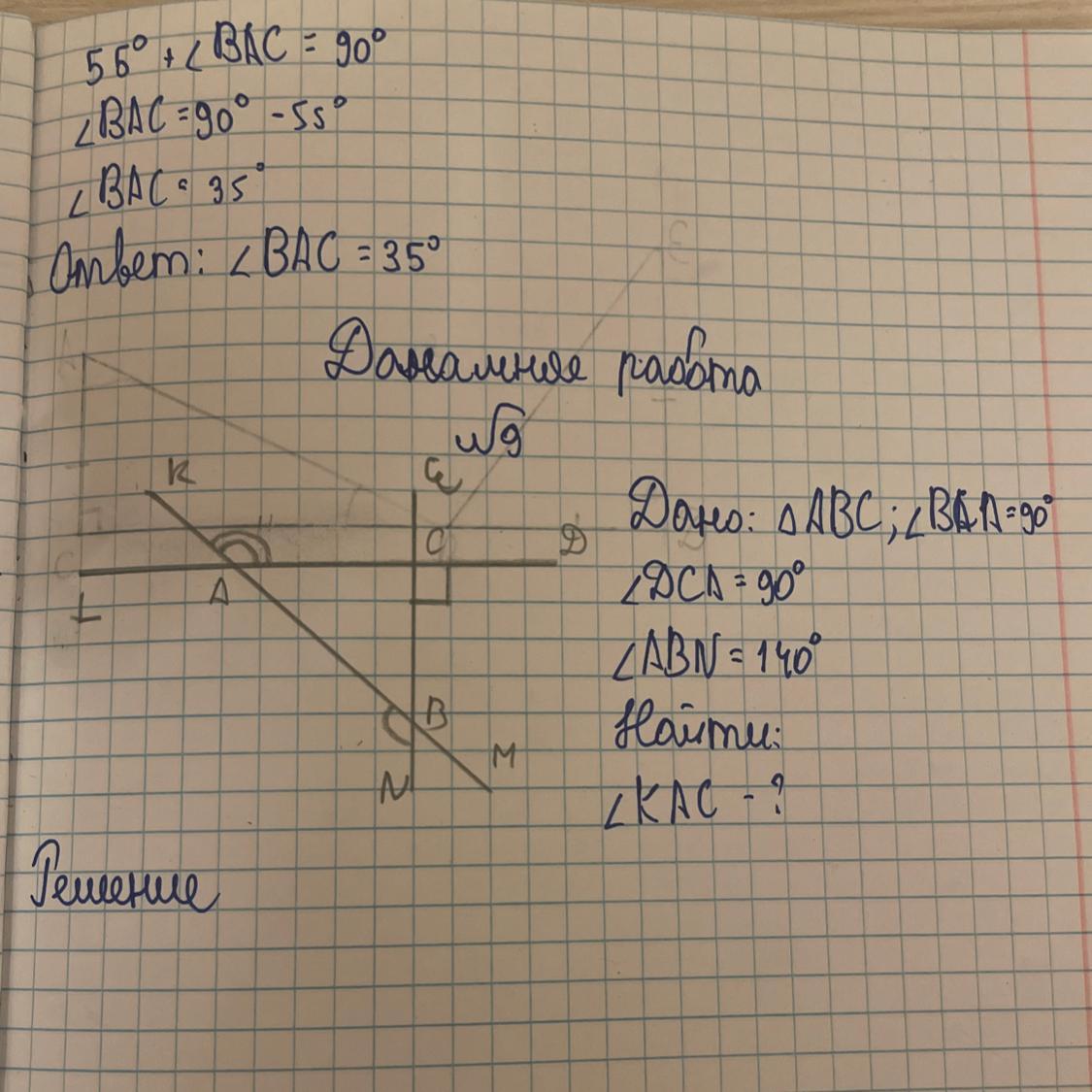 Сумма внешних углов треугольника равна 360°. ∠КАС=360°-∠ABN-∠DCB=360°-140°-90°=130°