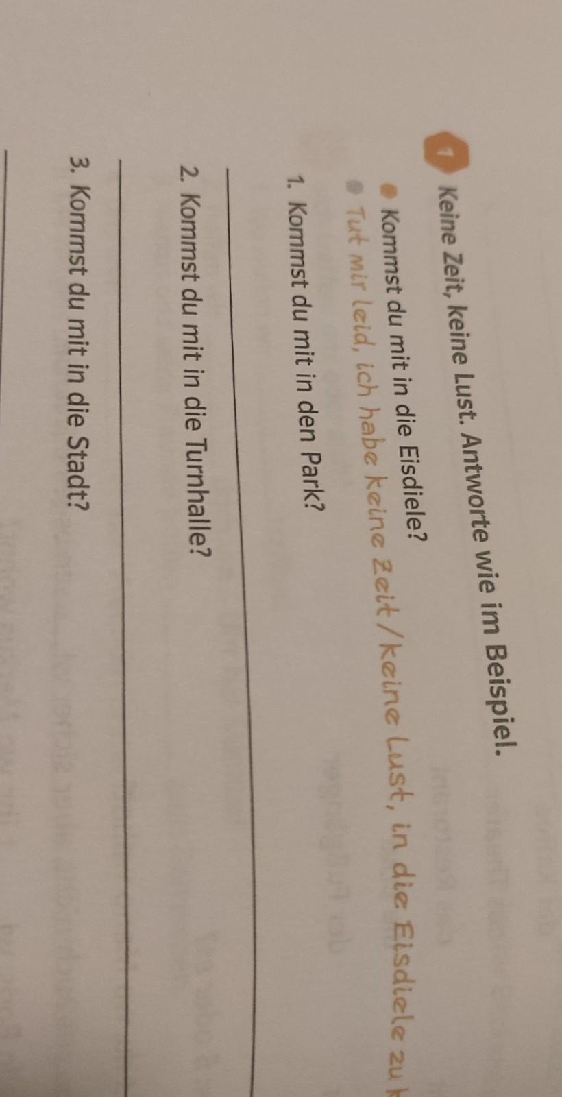 ПОМОГИТЕ ПЖ Keine Zeit, keine Lust. Antworte wie im Beispiel. Kommst du mit in die Eisdiele? Tut mir leid, ich habe keine Zeit/keine Lust, in die Eisdiele zu kommen. 1. Kommst du mit in den Park? 2. Kommst du mit in die Turnhalle? 3. Kommst du mit in die Stadt? Ergänze frei.