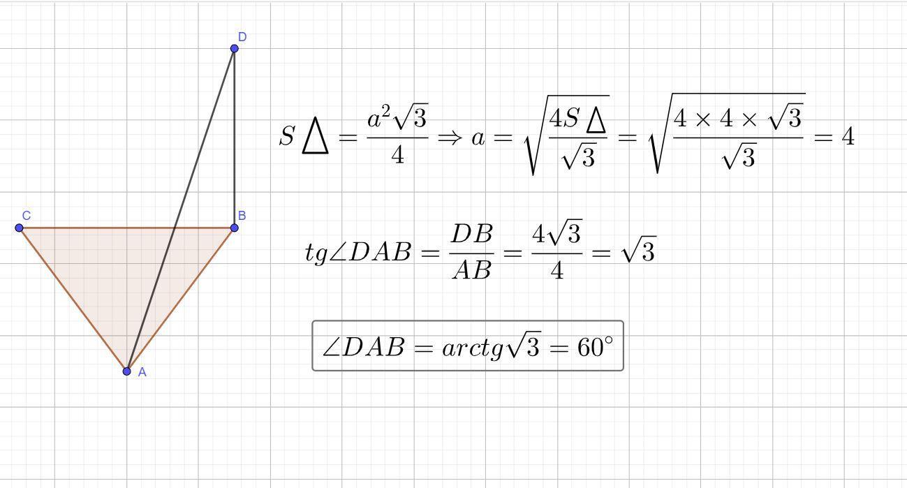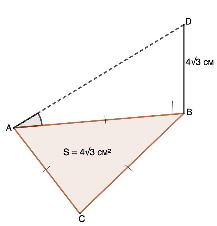 Через вершину В равностороннего треугольника АВС к его плоскости провели перпендикуляр DB длиной 4√3 см. Найти угол между прямой AD и плоскостью треугольника, если его площадь равна 4√3 см².