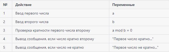 Задача: Написать программу, которая будет запрашивать у пользователя два числа, а затем проверять, кратно ли первое число второму. Если кратно, то программа должна выводить сообщение "Первое число кратно второму", в противном случае - "Первое число не кратно второму".