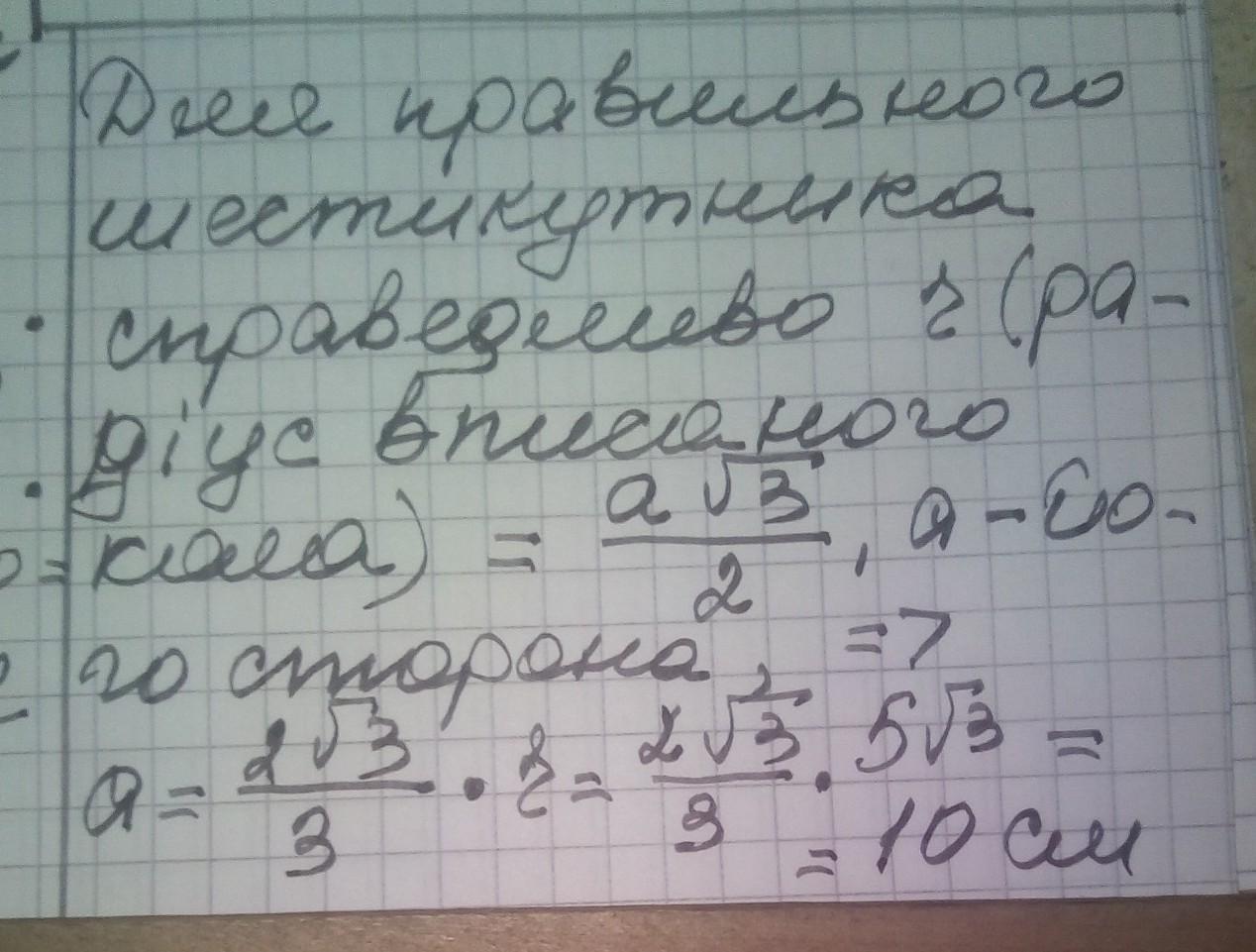 Радіус кола, вписаного в правильний шестикутник , рівний 5√3 см. Знайдіть сторону шестикутника