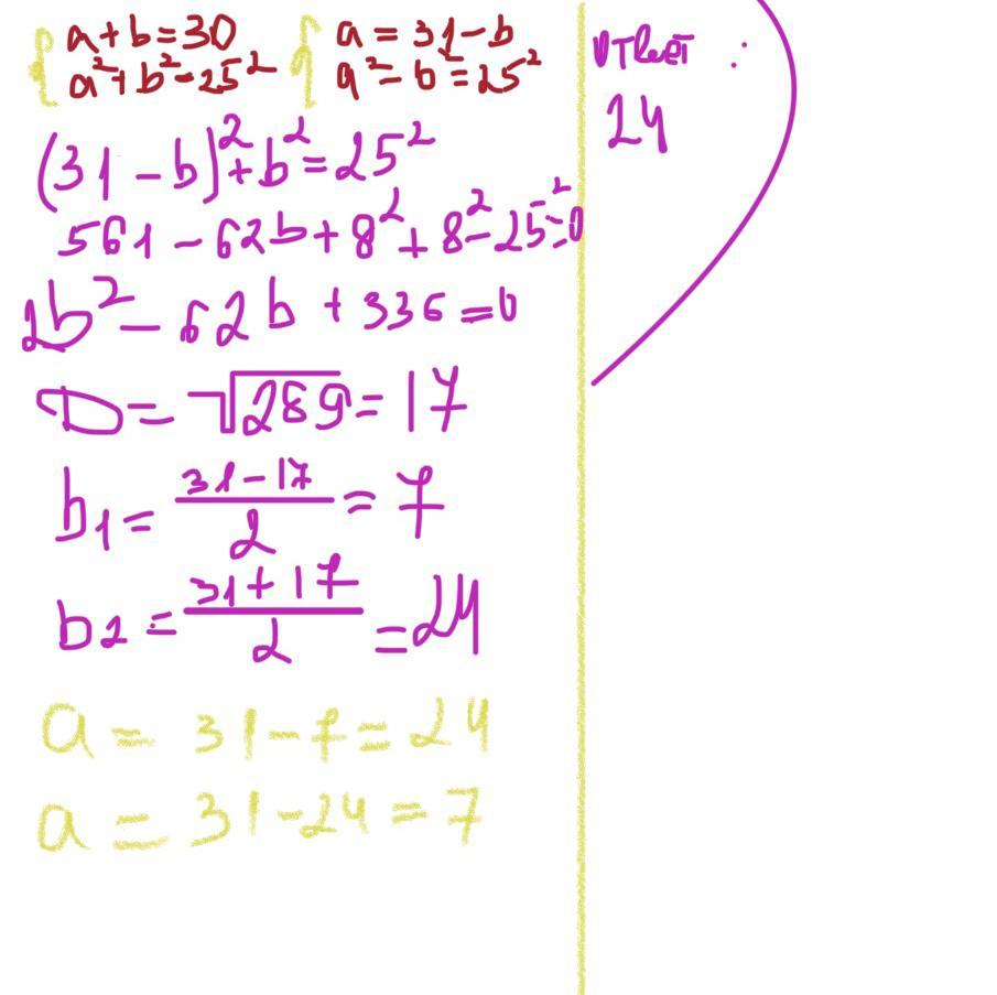 Найдите большой катет прямоугольного треугольника,если сумма катетов 31 см и гипотенуза 25см