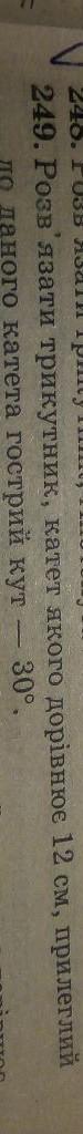 249. Розв'язати трикутник, катет якого дорівнює 12 см, прилеглии до даного катета гострий кут 30°.