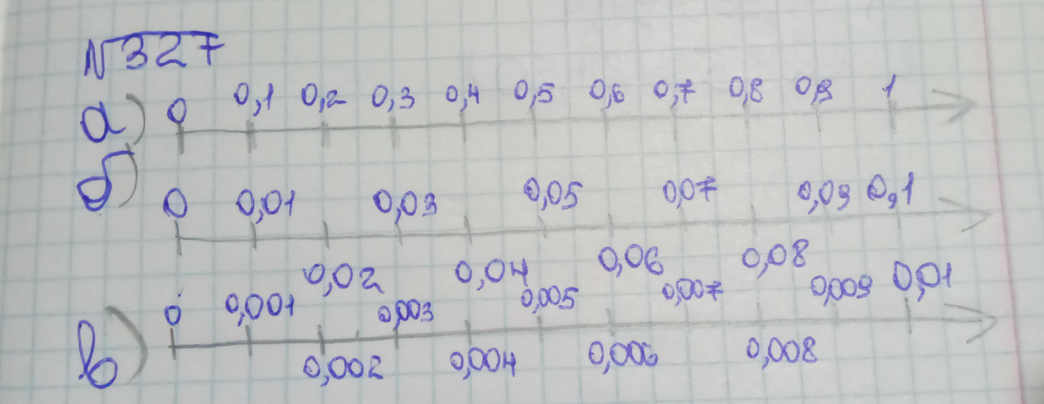327. Перечертите рис.З в тетрадь и над каждой штрих-чертой напишите число, ей соответствующее: 3 a) б) в) 0 0 0 0,1 0,01