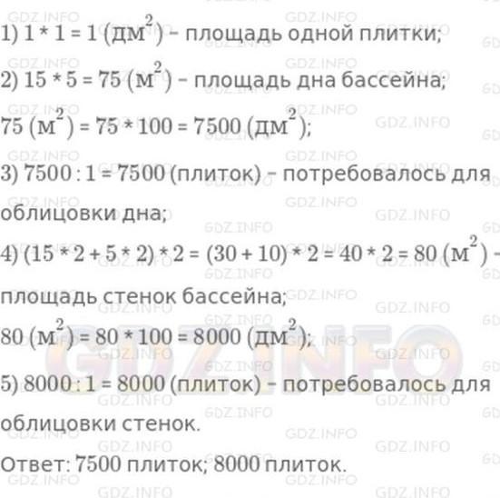 В санатории построили бассейн прямоугольной формы длина которого 15 м ширина 5m и глубина 2м Сколько квадратных кафельных плиток со стороной 1 дм каждая потребовалось для облицовки дна этого бассейна? стенок этого бассейна?