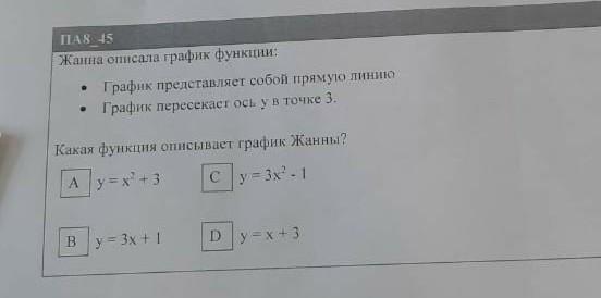 ПАК 15 Жанна описала график функции: • График представляет собой прямую линию • График пересекает ось у в точке 3. Какая функция описывает график Жанны? Ay=x² +3 y=3x2-1 B y=3x+1 C Dy=x+3