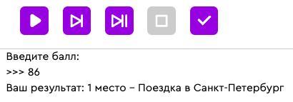 В программе уже имеется функция, распределяющая места по набранным баллам. Напиши ещё одну функцию, которая будет получать на вход занятое место и печатать соответствующий приз. Распределение призов: