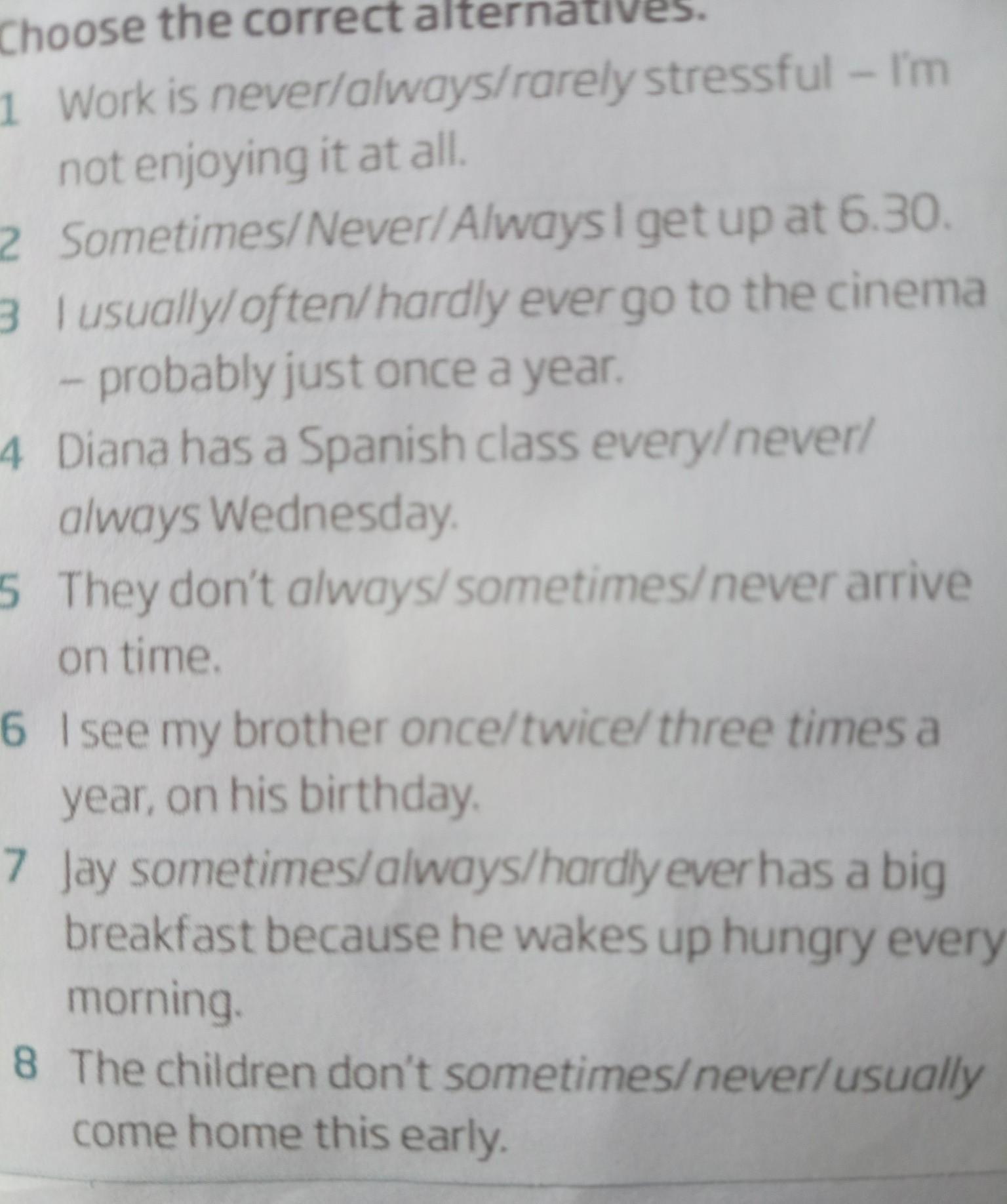 Choose the correct alternatives. 1 Work is never/always/rarely stressful - I'm not enjoying it at all. 2 Sometimes/Never/Always I get up at 6.30. I usually/often/hardly ever go to the cinema 3 - probably just once a year. 4 Diana has a Spanish class every/never/ always Wednesday. 5 They don't always/sometimes/never arrive on time. 6 I see my brother once/twice/ three times a year, on his birthday. 7 Jay sometimes/always/hardly ever has a big breakfast because he wakes up hungry every morning. 8 The children don't sometimes/never/usually come home this early.