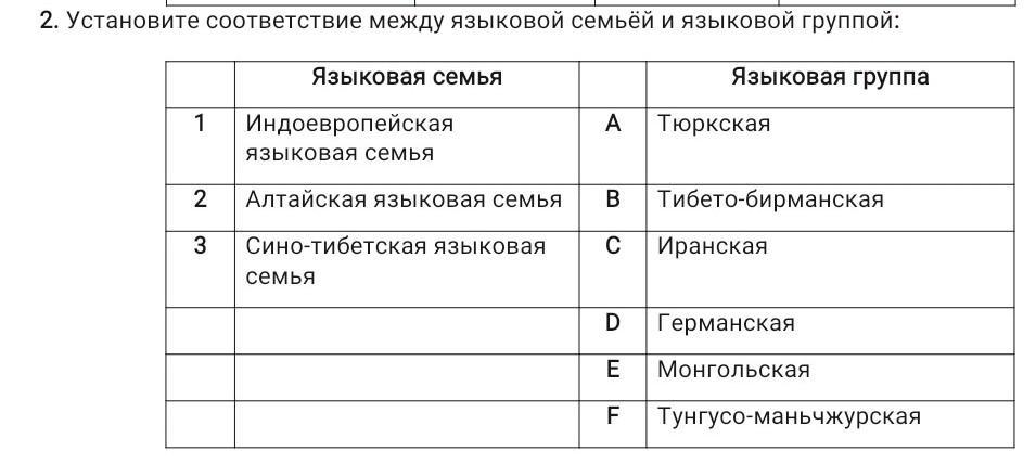 2. Установите соответствие между языковой семьёй и языковой группой: Языковая семья Языковая группа 1 Индоевропейская языковая семья 2 Алтайская языковая семья 3 Сино-тибетская языковая семья A Тюркская B Тибето-бирманская C Иранская D Германская E Монгольская F ТУНГyco-Маньчжурская. ПОМОГИТЕ ПОЖАЛУЙСТА СРОЧНО!!!!!!!!! ДАЮ 50 БАЛЛОВ
