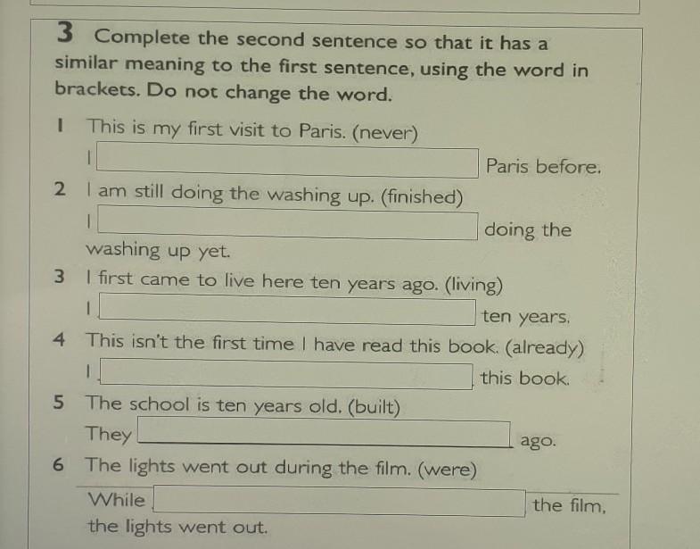 SAMSUNG 3 Complete the second sentence so that it has a similar meaning to the first sentence, using the word in brackets. Do not change the word. I This is my first visit to Paris. (never) 1 2 I am still doing the washing up. (finished) Paris before. doing the washing up yet. 3 I first came to live here ten years ago. (living) While the lights went out. ten years. 4 This isn't the first time I have read this book. (already) 1 this book. 5 The school is ten years old. (built) They 6 The lights went out during the film. (were) ago. the film,