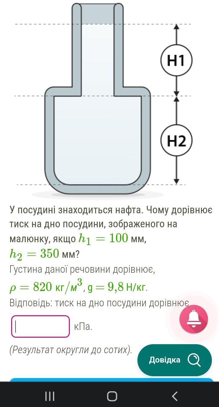 - У посудині знаходиться нафта. Чому дорівнює тиск на дно посудини, зображеного на малюнку, якщо h 100 мм, h2 350 мм? = Н1 Н2 (Результат округли до сотих). Густина даної речовини дорівнює, p= 820 кг/м³, g = 9,8 Н/кг. - Відповідь: тиск на дно посудини дорівнює кПа. Довідка о