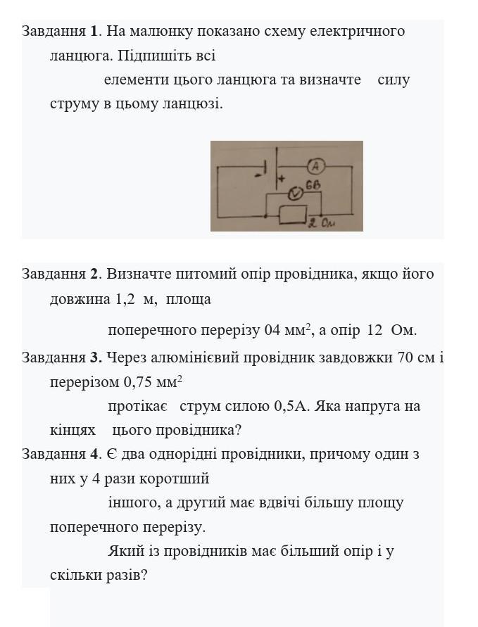Завдання 1. На малюнку показано схему електричного ланцюга. Підпишіть всі елементи цього ланцюга та визначте силу струму в цьому ланцюзі. A 66 Завдання 2. Визначте питомий опір провідника, якщо його довжина 1,2 м, площа 2 OM поперечного перерізу 04 мм², а опір 12 Ом. Завдання 3. Через алюмінієвий провідник завдовжки 70 см і перерізом 0,75 мм² протікає струм силою 0,5А. Яка напруга на поперечного перерізу. кінцях цього провідника? Завдання 4. Є два однорідні провідники, причому один з них у 4 рази коротший іншого, а другий має вдвічі більшу площу скільки разів? Який із провідників має більший опір і у