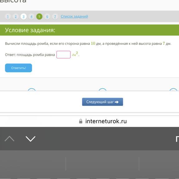 Вычисли площадь ромба, если его сторона равна 10 дм, а проведённая к ней высота равна 7 дм.