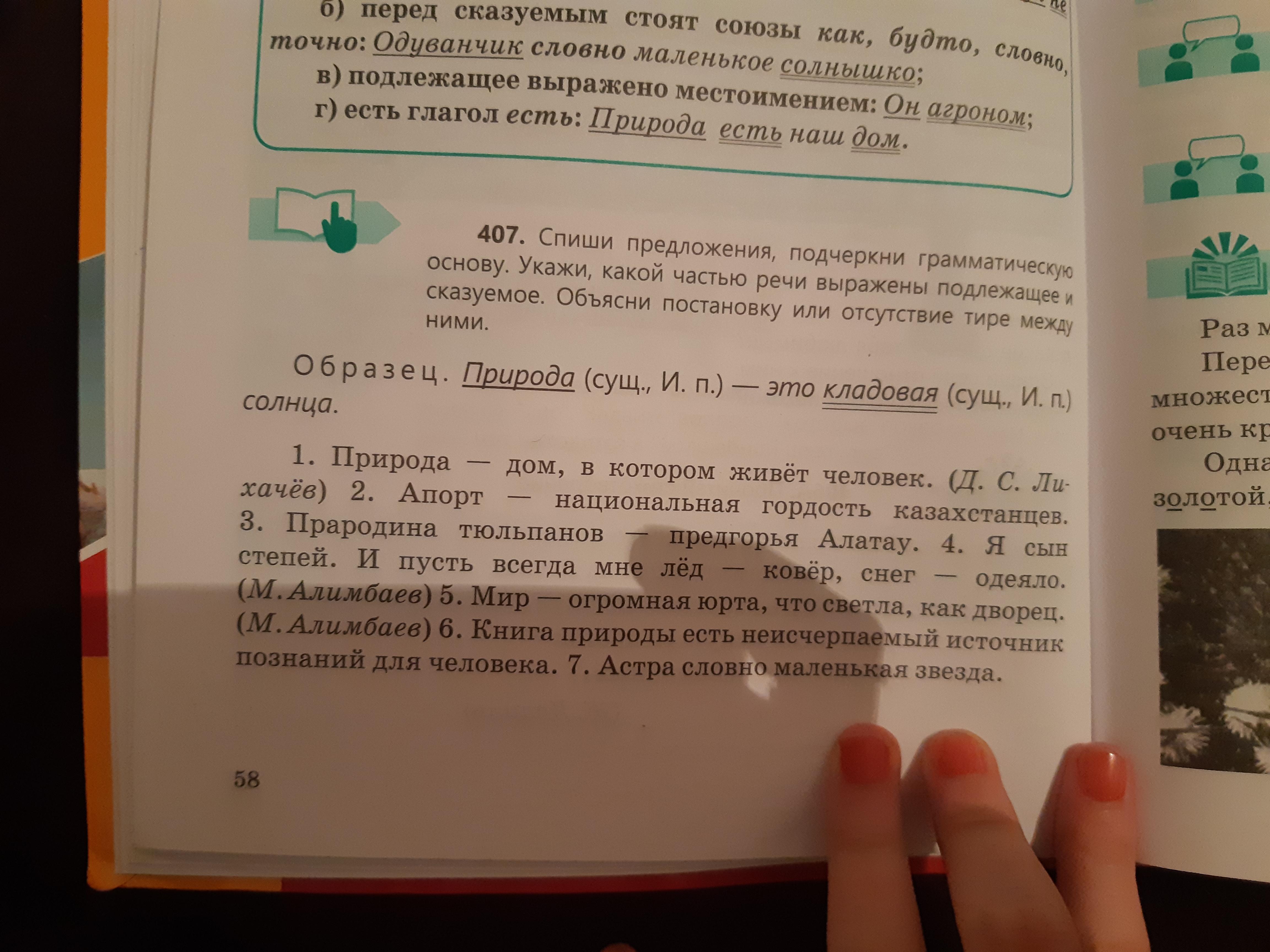 Помогите пожалуйста плис дам хоть 40 баллов короче открой картинку если не открываеться то вот Природа (существует,и.п)-это кладовая (существую,и.п)солнца дальше текст Природа -дом,в котором живёт человек .Апорт -национальная гордость казахстанцев.Прародина тюльпанов-предгорья Алтау.Я сын степей.И пусть всегда мне лёд -ковёр,снег одеяло. Мира -огромнаяюрта,что Светлана,как дворец.Книга природы есть неисчерпаймый источник познаний для человека.Астра словно маленькая звезда.номер 407 стр 58 русский язык 2 часть 2017 года З.К.Сабитова К.С.Скляренко 5 класс