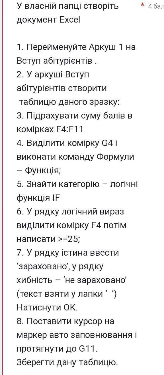 СДЕЛАЙТЕ КТО ТО ПОЖАЛУСТА У власній папці створіть документ Еxcel 1. Перейменуйте Аркуш 1 на Вступ абітурієнтів . 2. У аркуші Вступ абітурієнтів створити таблицю даного зразку: 3. Підрахувати суму балів в комірках F4:F11 4. Виділити комірку G4 і виконати команду Формули — Функція; 5. Знайти категорію – логічні функція IF 6. У рядку логічний вираз виділити комірку F4 потім написати >=25; 7. У рядку істина ввести ‘зараховано', у рядку хибність — ‘не зараховано (текст взяти у лапки ‘) Натиснути ОК. 8. Поставити курсор на маркер авто заповнювання і протягнути до G11. Зберегти дану таблицю