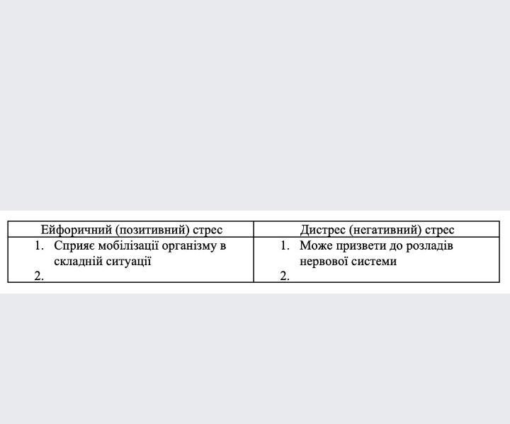 стресу. Еустрес нетривалий, завдяки чому організм активує свої системи для "збереження життя", але не встигає їх вичерпати, тому згубного впливу еустрес не завдає. Дистрес - це "шкідливий" стрес, внаслідок якого вичерпуються захисні сили організму та зриваються механізми адаптації, організм слабшає, що призводить