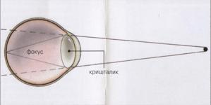 В її центрі розташована зіниця, що звужується або розширюється так, щоб пропустити на сітківку певну кількість променів. За зіницею розташований кришталик, че-рез який промені попадають на світлочутливу задню стінку очного яблука - сітківку (геїіпа). Функція кришталика - заломлення променів. Це можливо завдяки зміні форми кришта-лика, що відбувається за допомогою напруження або ж скорочення м'язу повіки. Таким чином кришталик дозволяє побачити і нам далекі та близькі предмети.