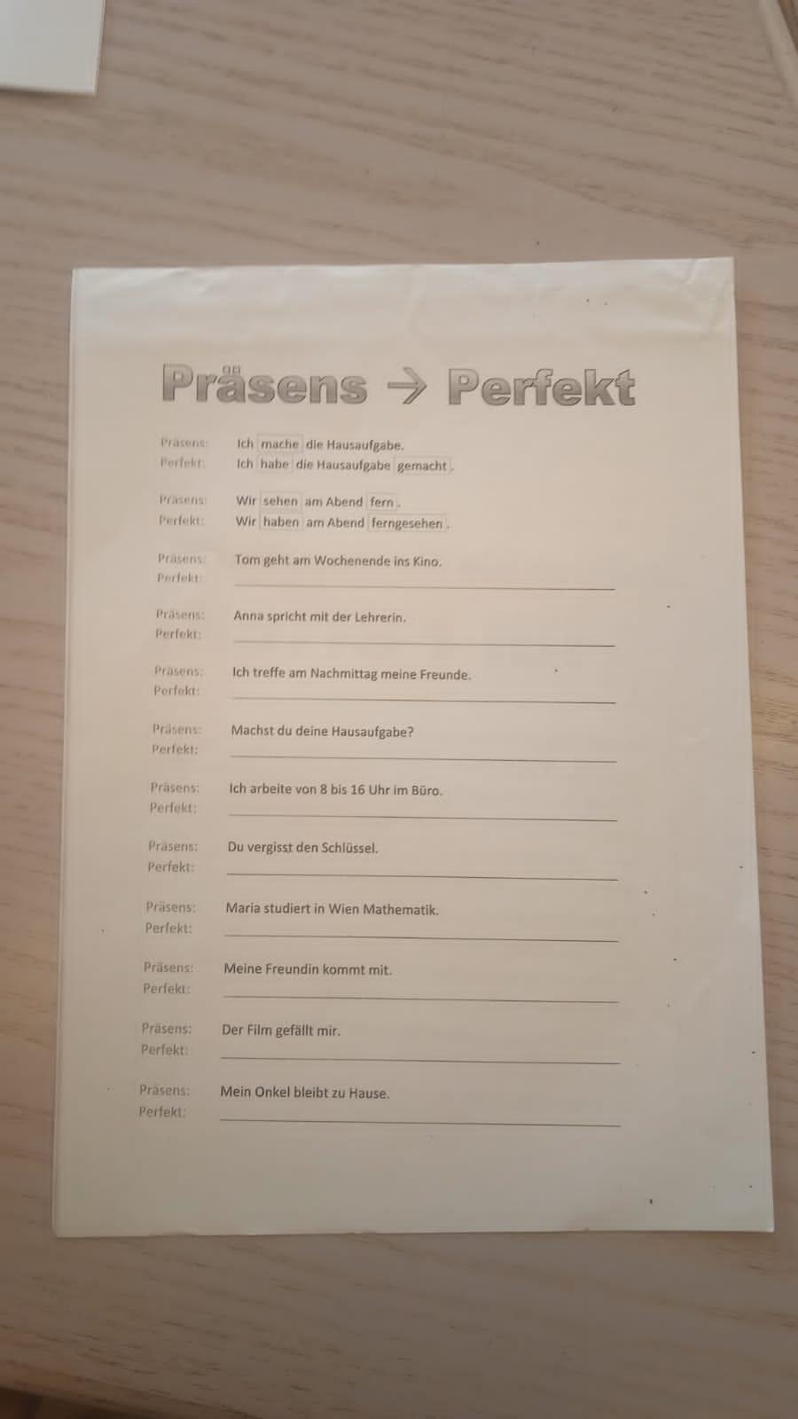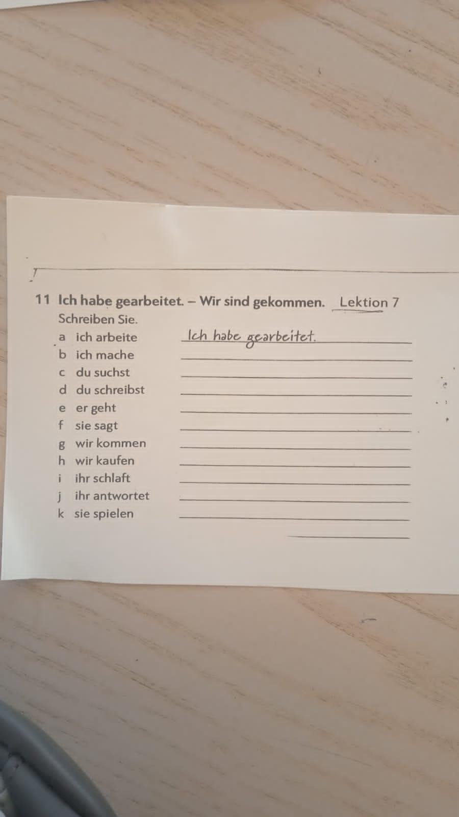 11 Ich habe gearbeitet. - Wir sind gekommen. Lektion 7 Schreiben Sie. a ich arbeite Ich habe gearbeitet. b ich mache c du suchst d du schreibst e er geht f sie sagt g wir kommen h wir kaufen i ihr schlaft j ihr antwortet k sie spielen