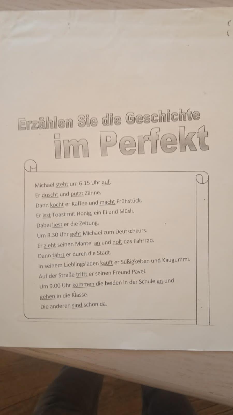 Dabei hat er die Zeitung gelesen. Um 8.30 Uhr ist Michael zum Deutschkurs gegangen.