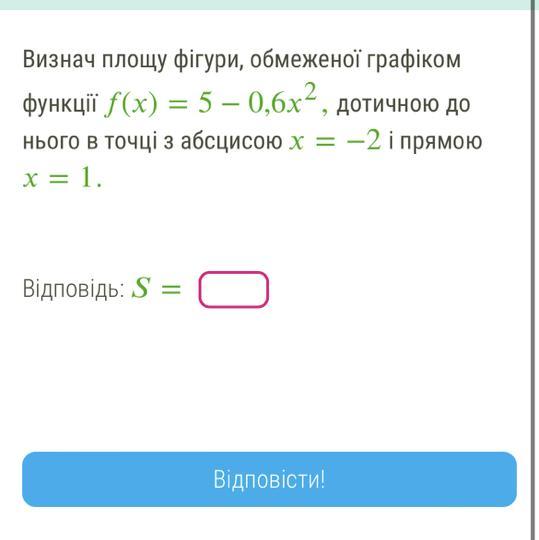 Завдання полягає у визначенні площі фігури, обмеженої графіком функції, дотичною та прямою. Це можна зробити за допомогою інтегралу: