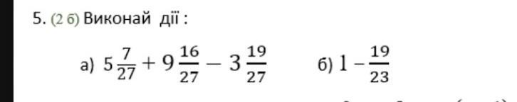 5. (2 б) Виконай дії: 16 577 +91/92-32/9/20 27 27 a) 5: 27 19 -233 23 6) 1- Завдання 5 має бути повністю з розв'язанням, з діями та з короткою умовою, якщо це задача.