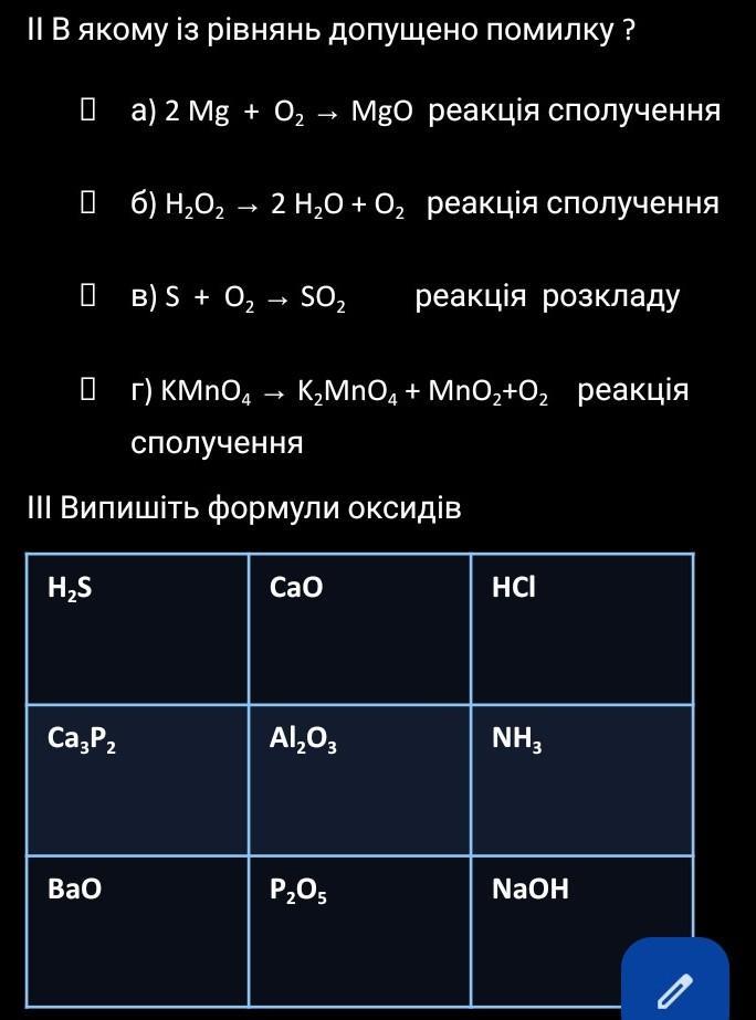 ІІ В якому із рівнянь допущено помилку ? ¢ а) 2 Mg + O2 → MgO реакція сполучення ¢ б) H2O2 → 2 H2O + O2 реакція с...
