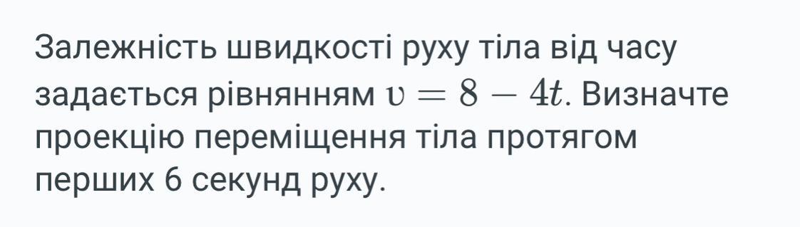 Залежність швидкості руху тіла від часу задається рівнянням v = 8 - 4t. Визначте проекцію переміщення тіла протягом