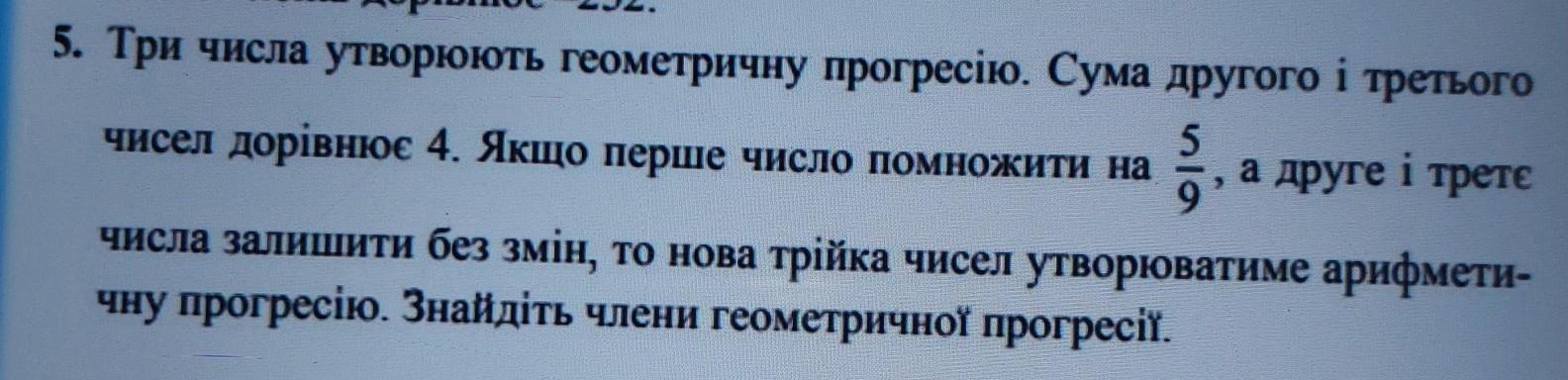 Три числа утворюють геометричну прогресію. Сума другого і третього чисел дорівнює 4. Якщо перше число помножити на 5/9, а друге і третє числа залишити без змін, то нова трійка чисел утворюватиме арифмети- чну прогресію. Знайдіть члени геометричної прогресії.