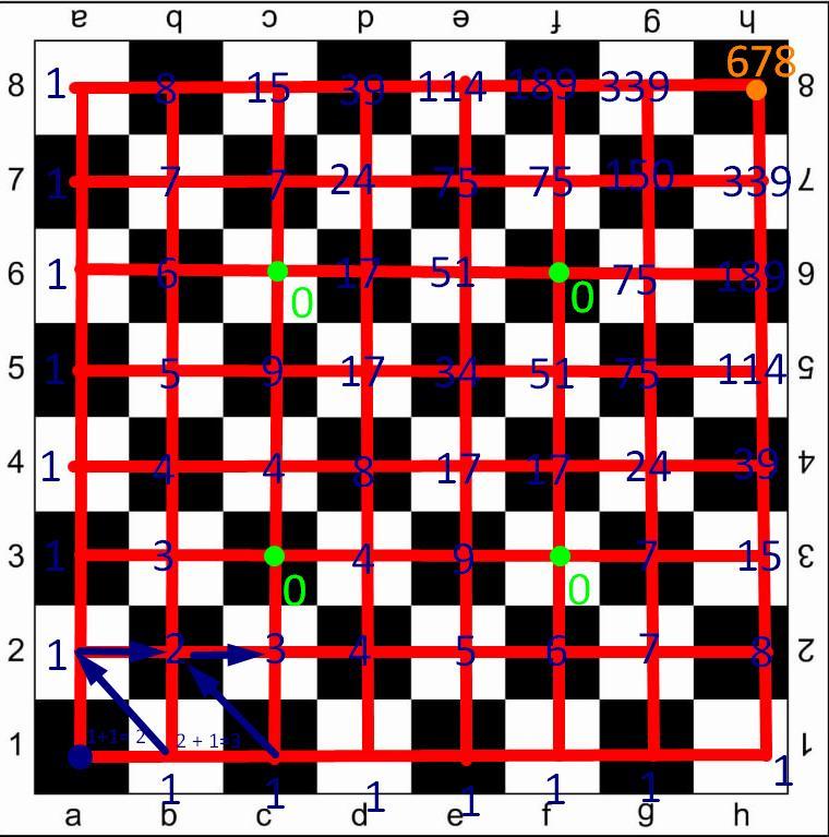 Просто вручную последовательно заполняем табличку 7×7 (поскольку мы перемещаемся по узлам ) , складывая значения в граничащих с текущей узлах слева и снизу. То есть мы как бы складываем числа которые находятся по диагонали , а результат записываем в правом узле , число находящиеся в данном узле и будет кол-вом путей , которыми мы можем добраться из a1 до определенного узла , мы продолжаем данную операцию , до узла h8 , при этом этом не беря в счет пути которыми мы можем добраться из в a1 в c3,c6,f3,f6 т.е на данные точки мы ставим нолик