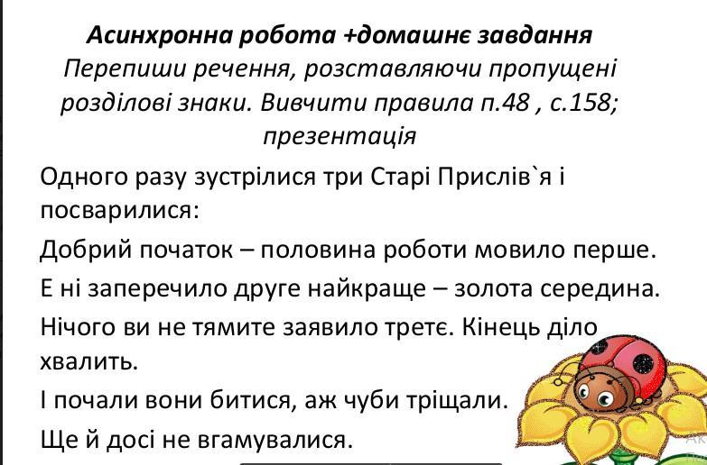 Одного разу, зустрілися три Старі Прислів'я, і посварилися: Добрий початок - половина роботи, мовило перше. Е ні, заперечило друге, найкраще - золота середина. Нічого ви не тямите заявило третє. Кінець діло хвалить. І почали воно битися, аж чуби тріщали. Ще й досі не вгамувалися.
