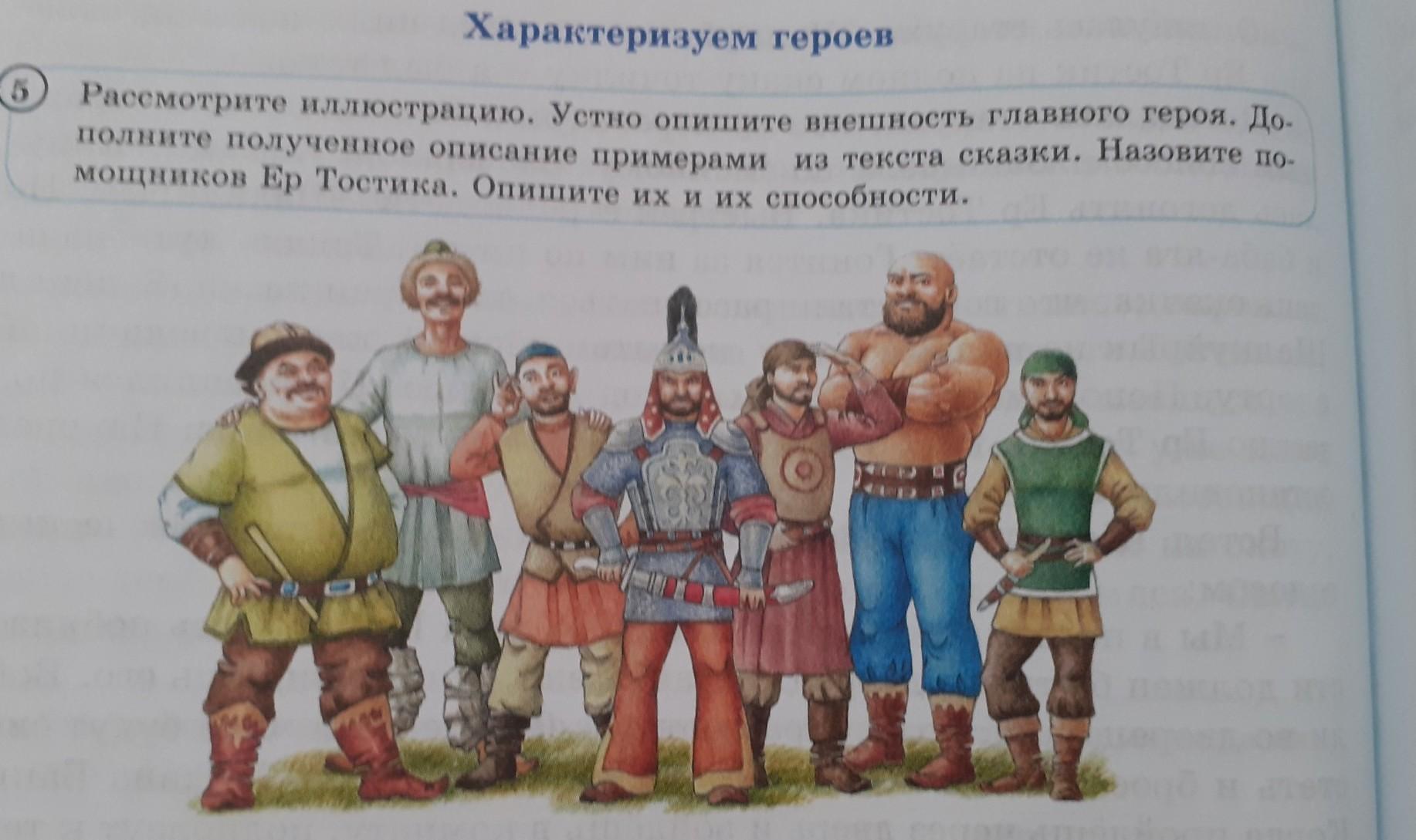 5 Рассмотрите иллюстрацию. Устно опишите внешность главного героя. полните полученное описание примерами из текста сказки. Назовите мощников Ер Тостика. Опишите их и их способности.