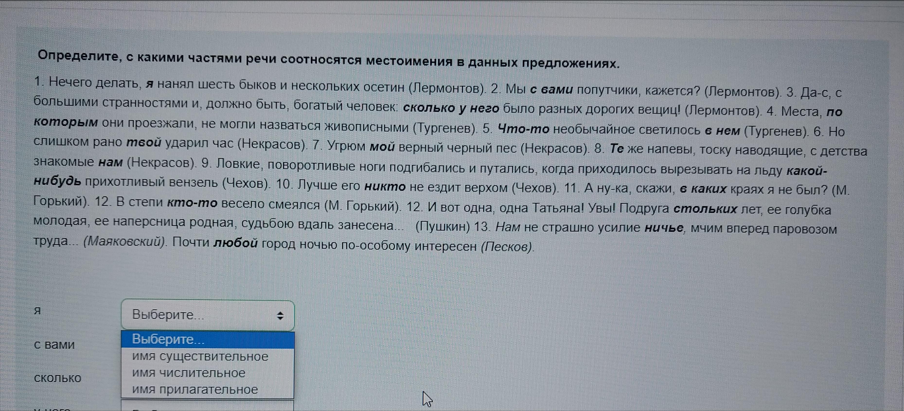 Существительное: я, с вами, твой, в нём, нам, мой.