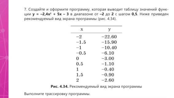 7. Создайте и оформите программу, которая выводит таблицу значений функ- ции у = -2,4х2 + 5х - 3 в диапазоне от -2 до 2 с шагом 0,5. Ниже приведен рекомендуемый вид экрана программы (рис. 4.34). X -2 -1.5 -1 -0.5 0 0.5 1 1.5 2 У -22.60 -15.90 -10.40 -6.10 -3.00 -1.10 -0.40 -0.90 -2.60 Рис. 4.34. Рекомендуемый вид экрана программы