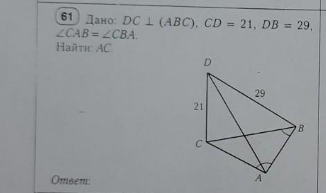 - Если прямая перпеликулярна некой плоскости, то она перпендикулярна всем прямым, лежащим в данной плоскости. DC ⟂ (ABC)(по условию), ВС ∈ (АВС) ⇒ DC⟂BC, следовательно ∆DCB - прямоугольный. Катет ВС согласно Т.Пифагора равен: BC = √(BD²-CD²) = √(29²-21²) = √(841-441)=√400 = 20. А т.к. ∆АВС - равнобедренный, то АС = ВС = 20(ед) - как боковые стороны равнобедренного треугольника.