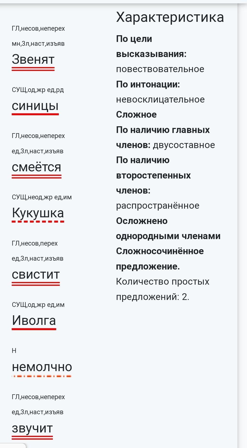 спеши предложения Расставь недостающие знаки препинания сделай разбор по частям речи Определи вид предложения простое сложное текст звенят синицы смеётся Кукушка свистит Иволга немолчно звучит песня зяблика задумчиво поет странная прица щур . Япроснулся когда самолёт уже стоял на земле. качество настоящего человека - это честность правдивость и справедливость. сёстры жили душа в душу а вот братья как кошка с собакой