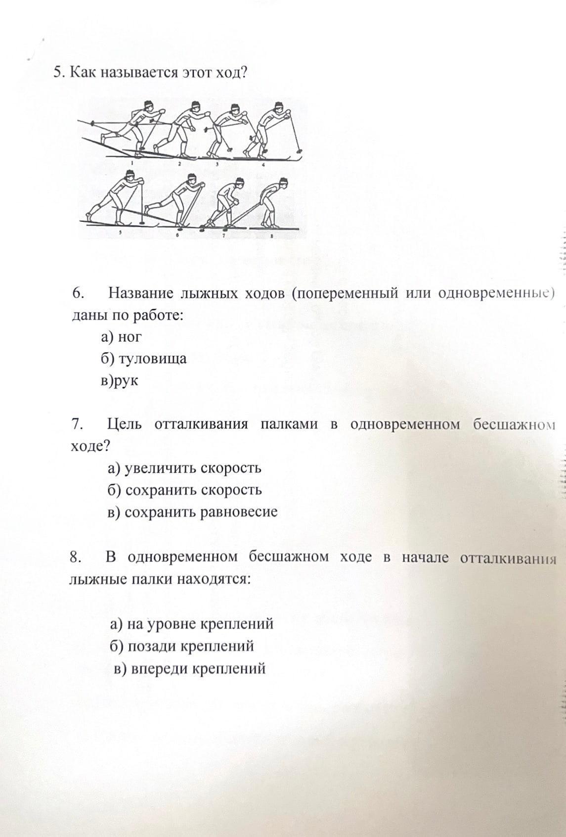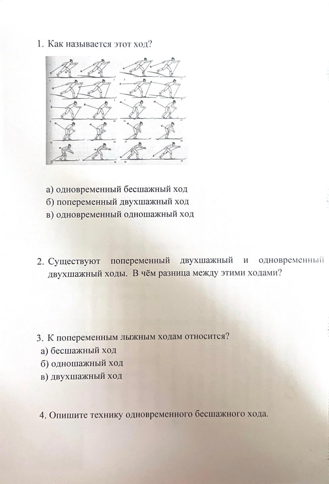 Ответ: 1:б 2:в работе рук 3:в 4: Одновременный бесшажный ход используется на пологих спусках, а при хорошем скольжении на равнине (на ровных участках местности)