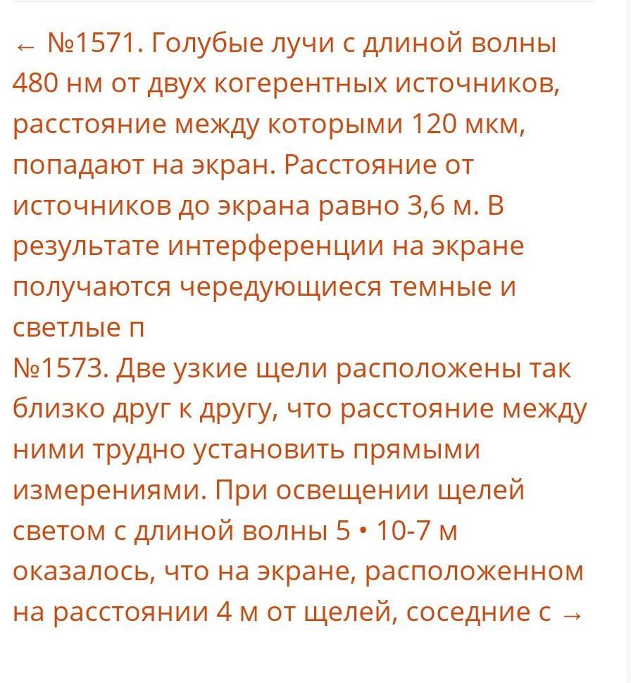 13.Когерентные источники белого света, расстояние между которыми 0,32 мм, имеют вид узких щелей. Экран, на котором наблюдают интерференцию света от этих источников, находится на рас- стоянии 3,2 м от них. Найдите расстояние между красной () = 760 нм) и фиолетовой (~ = 400 нм) - линиями второго интерференционного спектра на экране.