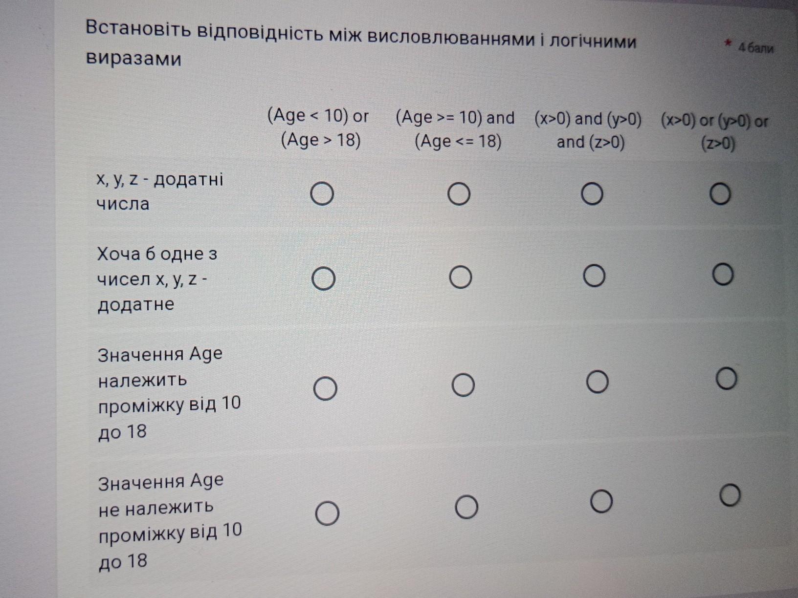 3) (Age >= 10) and (Age <= 18) – значення Age належить проміжку від 10 до 18;